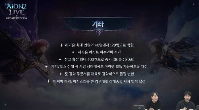 레기온의 최대 인원이 기존 40명에서 128명으로 상향하며, 레기온 아지트에 허수아비를 추가한다. 또 창고 확장 가능 칸 수를 최대 400칸(36줄-> 80줄)으로 증가시키며, 파티 및 포스 상태에서 사망 시 아이템 획득이 가능하도록 개선한다. 이외에도 룬 강화 주문서를 재료로 강화석으로 물질 변환이 가능해지며 마지막 타격 및 어시스트를 한 경우에도 상대 종족 처치 업적을 달성할 수 있도록 변경한다.