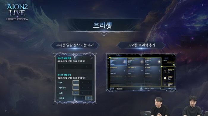 많은 이용자들이 요청해왔던 프리셋 기능이 추가된다. 프리셋 일괄 장착 기능과 함께, 타이틀 프리셋을 추가하면서 편의성을 높일 계획이다. 날개 프리셋의 경우 내부 검토 후 적용하겠다는 입장이다.