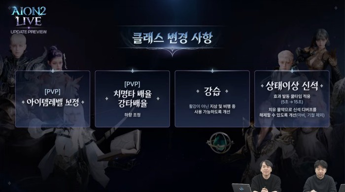 이날 방송에서는 14일의 주요 업데이트 내용에 대해 소개하는 한편, 21일로 예정돼 있는 시즌2에 대한 정보를 일부 공개했다. 특히 14일 업데이트에서는 PvP 콘텐츠에 대한 일부 시스템을 조정하고, 정령성 / 마도성 / 살성 / 궁성 등에 대한 클래스 케어를 진행한다.