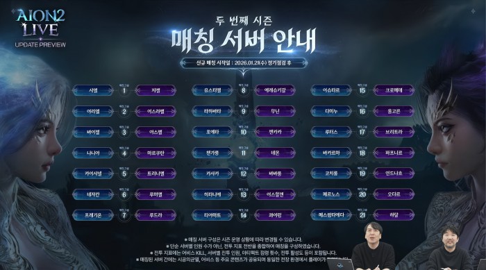 시즌2의 매칭 서버를 공개했으며, 시엘 서버와 지켈 서버, 아리엘 서버와 이스라펠 서버 간의 매칭이 이뤄진다. 서버 간의 자세한 매칭 정보는 다음과 같다.