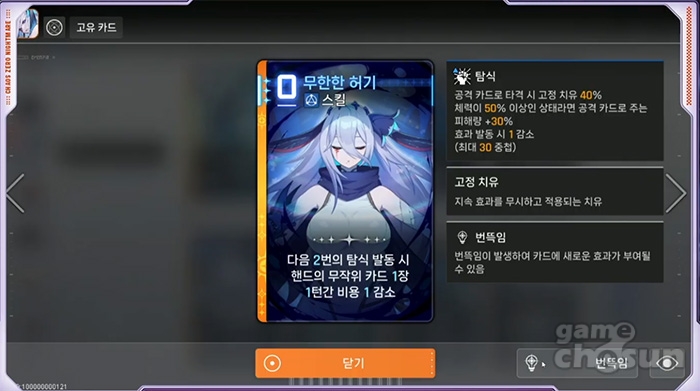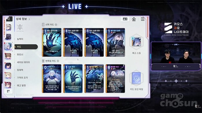 방송에서 소개된 바로는 '번뜩임' 효과를 통해 '유일' 효과를 가진 카드를 무려 4장이나 보유하고 있는 것으로 확인됐는데, 4 유일이라는 요소는 덱 압축에 엄청난 이점이 있는 능력인 만큼 추후 '카오스' 콘텐츠에서 가장 필수적인 전투원이 될 가능성이 매우 높아 보입니다.