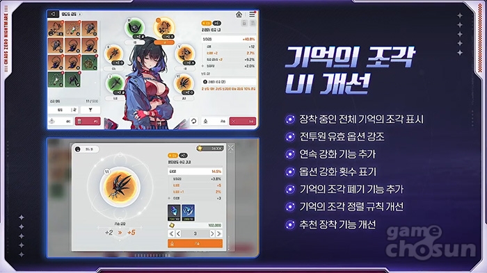 또, '기억의 조각' UI 개선도 다음과 같이 이루어집니다. 가장 중요한 추천 장착 기능의 경우 도입 초기에는 개발진이 임의로 지정한 추천 옵션 위주로 장착이 되지만 시즌2 시점에는 플레이 가이드가 도입될 예정으로 플레이어 데이터 기반으로 많이 사용되는 조각을 우선 추천할 예정입니다.