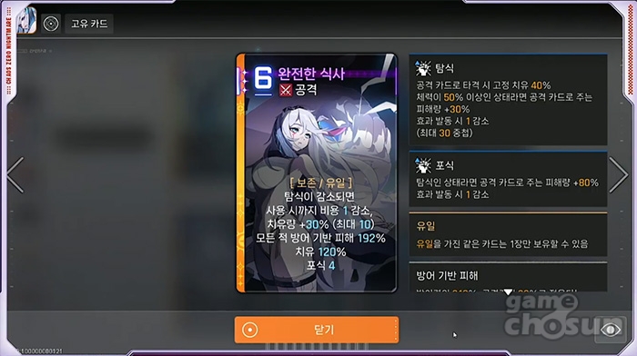 '탐식'의 피해량 증가와 '포식'의 피해량 증가는 합연산되어 세팅만 됐다면 아군의 피해량이 큰 폭으로 증가하는 것을 확인할 수 있으며, '탐식' 효과 자체만으로도 별다른 치유 카드 사용이 없더라도 꾸준한 배터리 치유 효과를 기대할 수 있다는 장점이 있습니다.