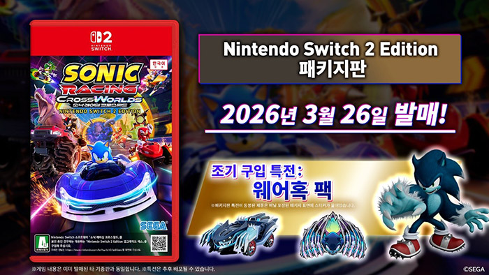 [자료제공 = 세가] 세가퍼블리싱코리아(대표 사이토 고)는 '소닉 레이싱 크로스월드'의 닌텐도 스위치 2 에디션 패키지판을 3월 26일(목)에 발매한다. 14일부터 각 매장에서 예약 접수가 시작되었으며, 조기 구입 특전으로는 '웨어혹 팩'이 증정된다.