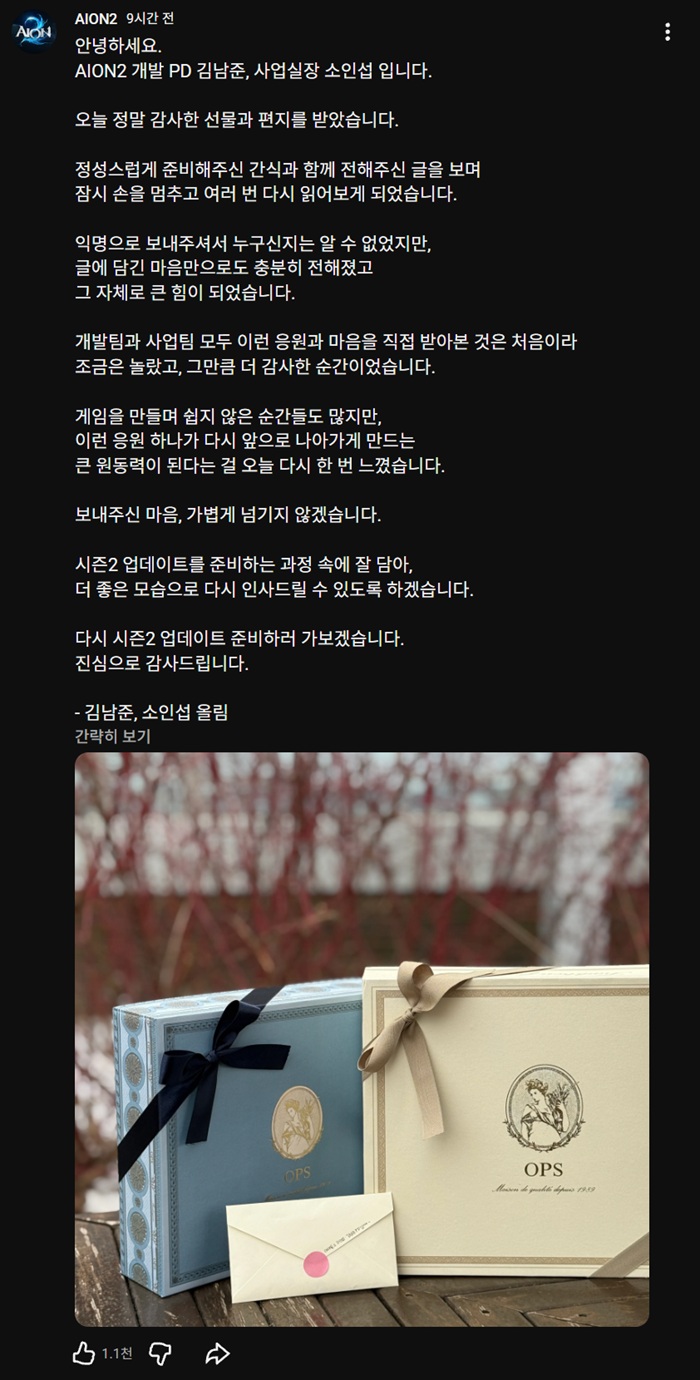 아이온2 개발을 총괄하고 있는 김남준 개발 PD와 소인섭 사업실장은 15일 공식 채널을 통해 익명의 이용자로부터 전달받은 선물과 편지에 대한 소감을 전했다.