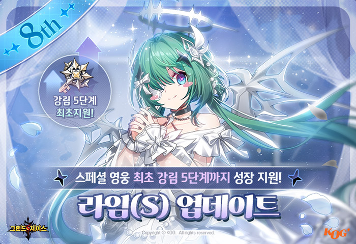 ‘라임’ 출시와 함께 8주년 기념 이벤트를 통해 다양한 혜택과 성장의 기회를 제공한다. 4주간 진행되는 ‘전용 성장 지원 이벤트’를 통해 최대 6초월, 25체이서, 15영혼각인까지 성장시킬 수 있다. 특히, 스페셜 영웅의 강림 5단계까지 무료로 지원하는 특별 혜택도 최초로 제공한다.