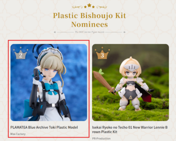 일본 대표 하비샵 ‘아미아미’가 매년 주최하는 ‘아미아미 피규어 어워드’에서도 ‘블루 아카이브’의 인기를 확인할 수 있다. 2021년부터 시행된 아미아미 피규어 어워드에서는 그해에 가장 많이 팔린 피규어를 선정한다. 올해 어워드에서는 밀레니엄 사이언스 스쿨 C&C 소속 학생 ‘아스마 토키’의 피규어가 각각 스케일 미소녀 피규어(4위, ‘토키(바니걸)’), 프라모델 미소녀키트(2위) 부문에서 판매순위 상위권을 차지했다. 2024년에는 ‘와카모’가 4위, 2023년에는 ‘아스나(바니걸)’ 피규어가 3위를 기록하기도 했다.