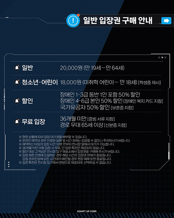 티켓 가격은 성인(만 19세~64세) 20,000원, 청소년 및 어린이(미취학~만 18세) 18,000원이다. 장애인(1~3급 동반 1인 포함, 4~6급 본인)과 국가유공자에게는 50% 할인 혜택이 제공되며, 36개월 미만 영유아 및 65세 이상 경로 우대 대상자는 무료로 입장할 수 있다. (증빙 서류 지참 필수)