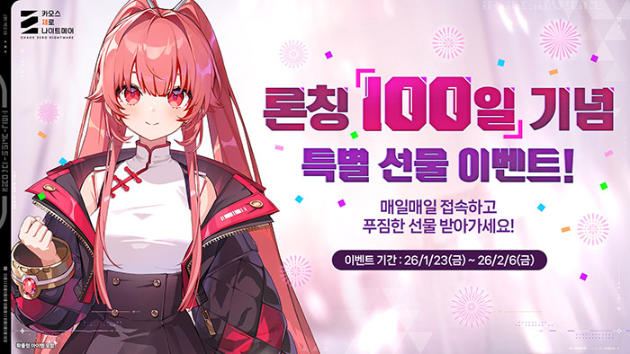 '카오스 제로 나이트메어'는 최근 2월 4일부터 시작될 예정인 대규모 업데이트 '은하계 재해 시즌2'를 공개하고, 세이브 데이터 수집 난이도 등 게임 스트레스 요인은 줄이고, 로그라이크 본연의 재미를 강화하는 콘텐츠 개편 및 개선과 함께 신규 콘텐츠, 신규 전투원 '나인'의 등장을 예고했다. 이번 100일 이벤트는 신규, 복귀 유저들이 시즌2 콘텐츠에 원활하게 적응할 수 있는 좋은 기회가 될 것으로 보인다.