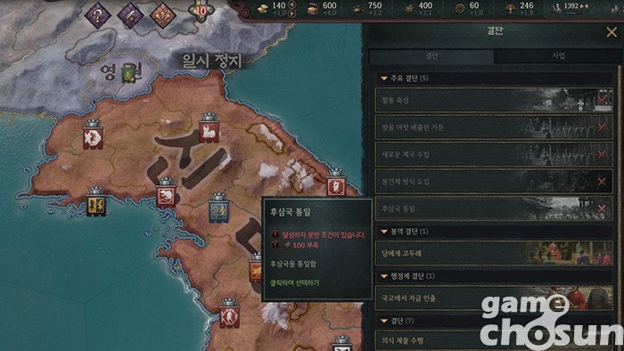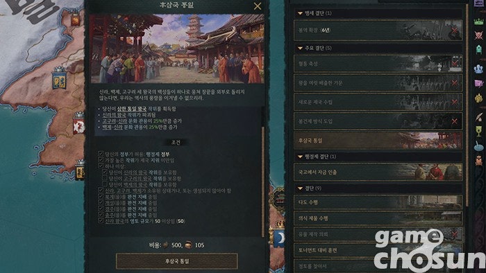 예를 들어 게이머 가문의 사유지인 장원이나 과거 시험을 보기 위한 여행은 사실 이전 DLC인 권력으로 향하는 길에서 아시아 색을 입힌 느낌이 강하죠. 또 이전에 보여줬던 행정제와 비교하면 이번 DLC 핵심 세력들의 고유 시스템이 겉핥기 수준으로 느껴질 수도 있고요. 특히 다양한 한반도 플레이를 기대했던 분이라면 후삼국 통일 외에 특별한 요소가 없어 실망하실 수도 있고요.