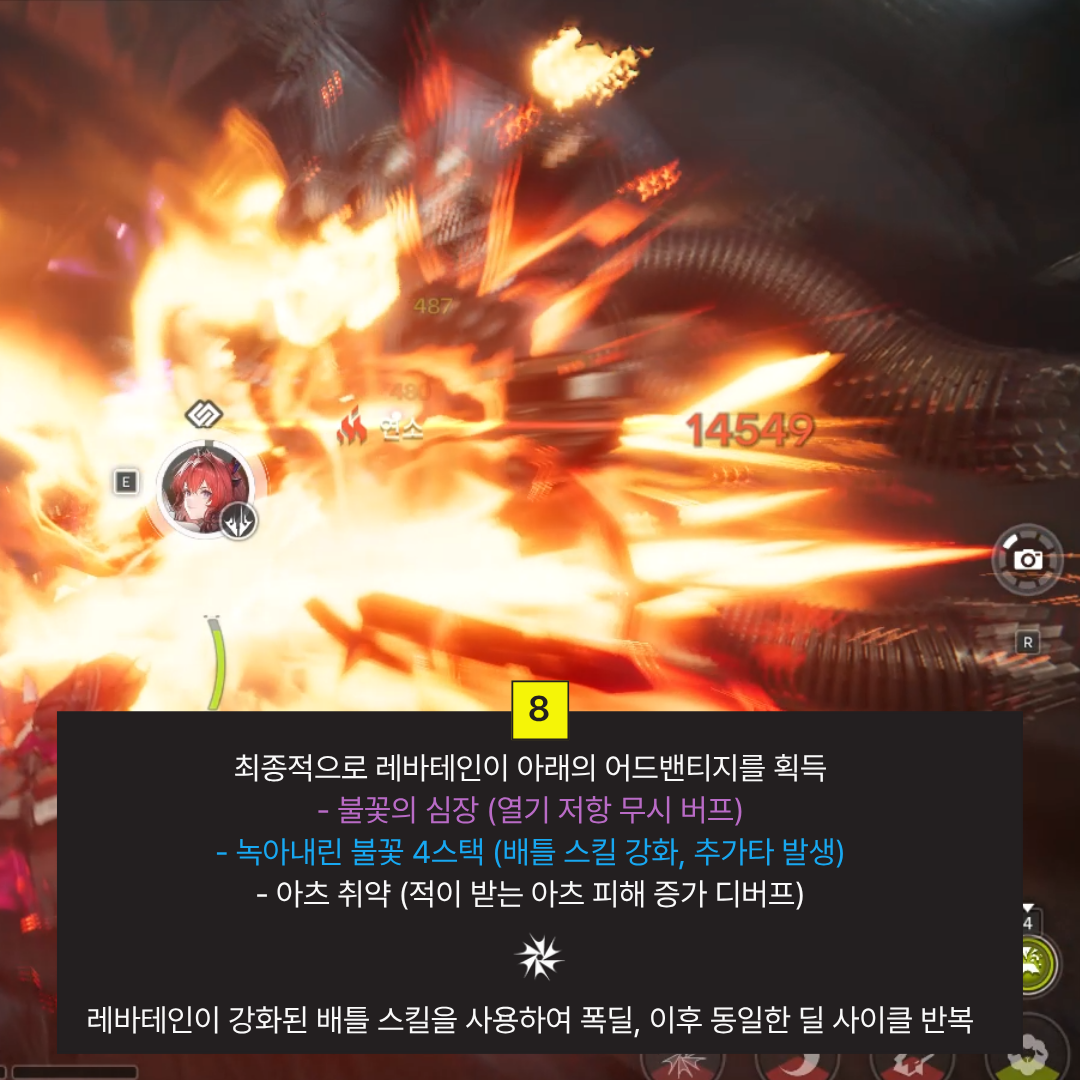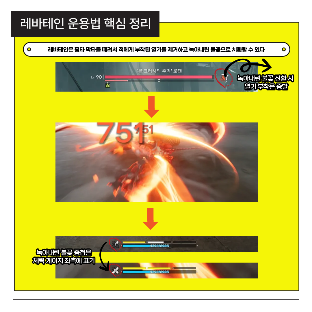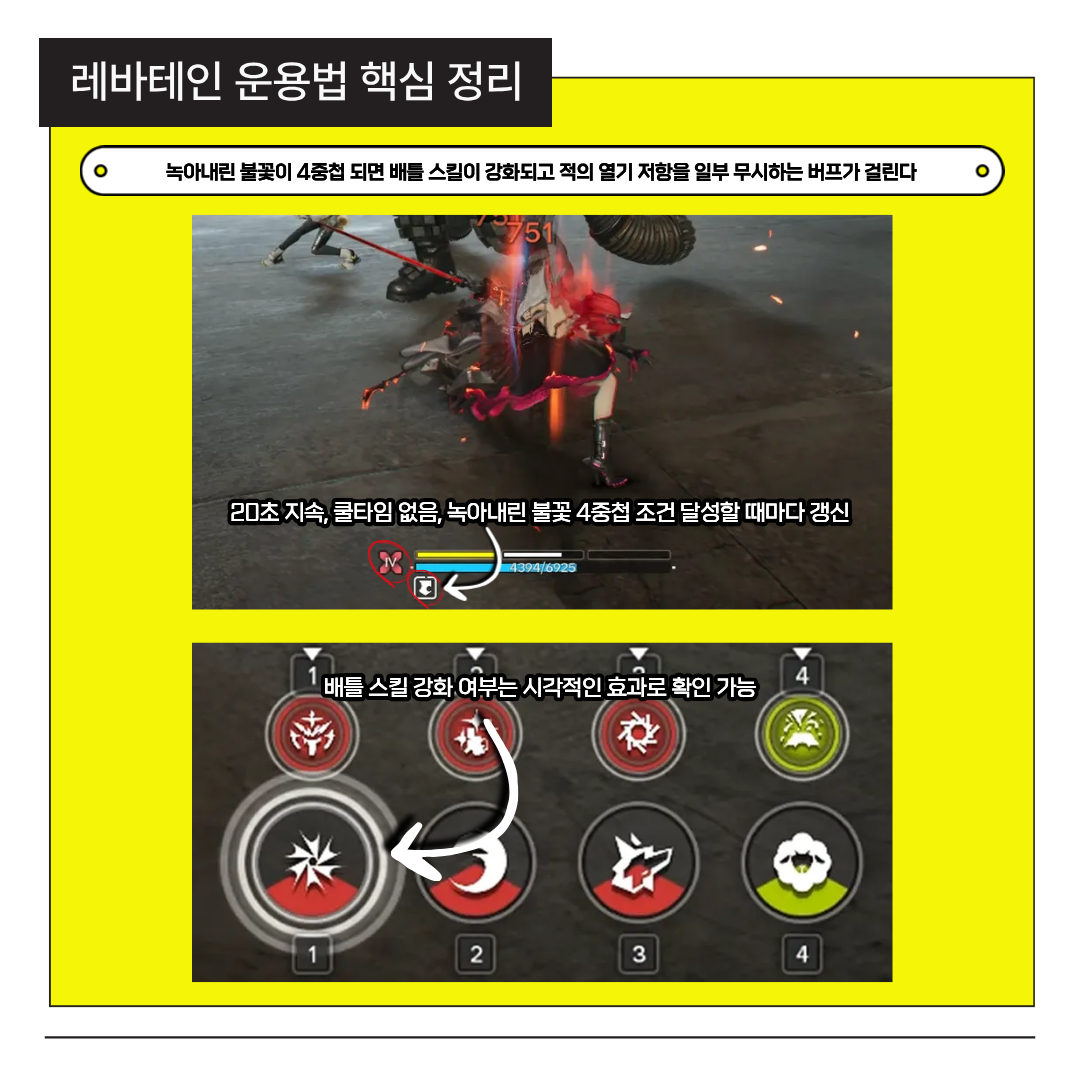 스킬 툴팁만 읽어보면 복잡해 보이지만 실은 아주 간단합니다. 열기 부착을 유발한 뒤 이를 강력한 일격 판정이 발생하는 평타 막타로 때려주거나, 적을 연소 또는 부식 상태로 만들어 레바테인이 연계 스킬을 사용하면 녹아내린 불꽃이 1회 쌓이고 이를 4회 쌓으면 불꽃의 심장이 켜지는 방식입니다.