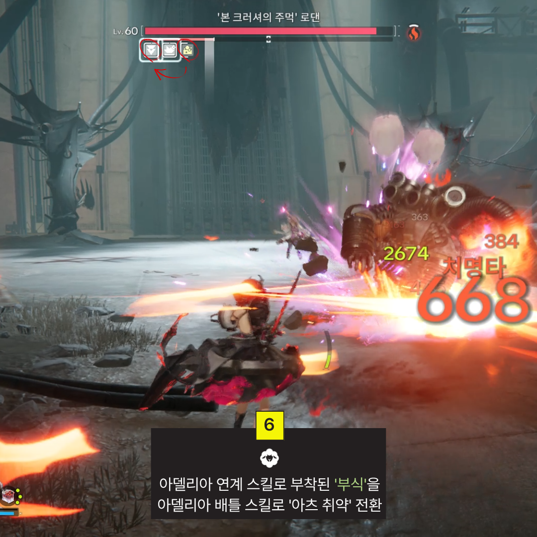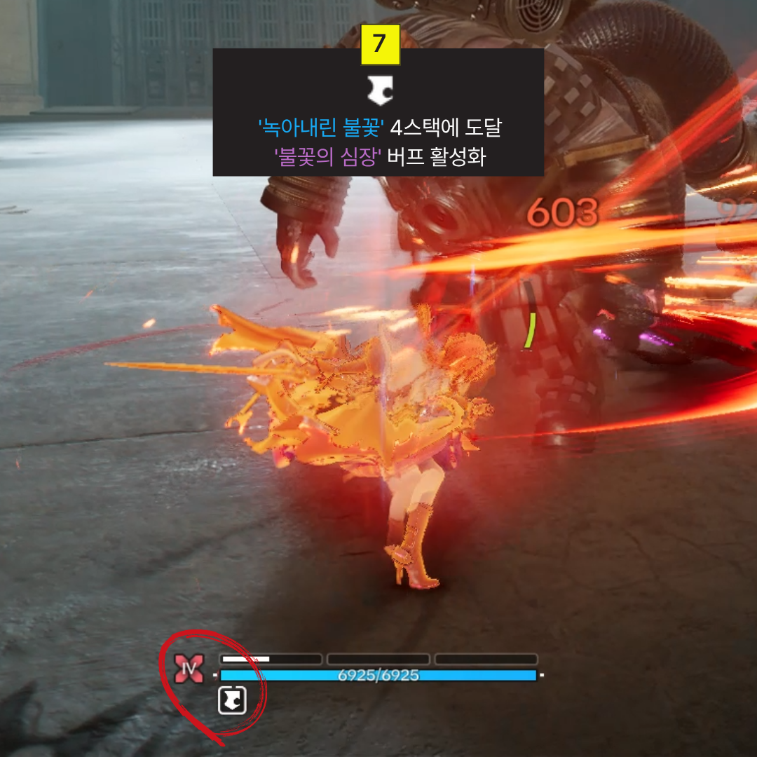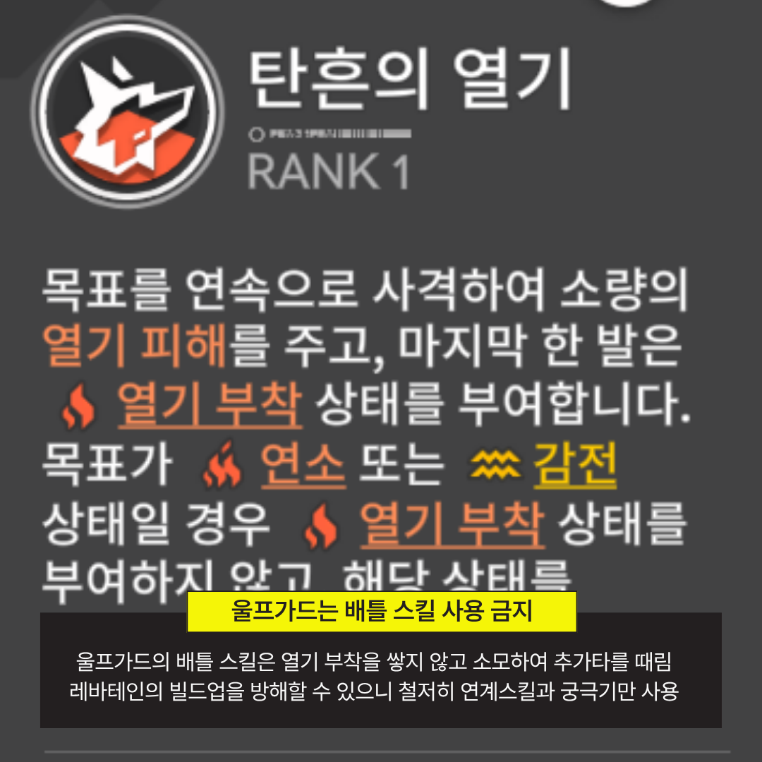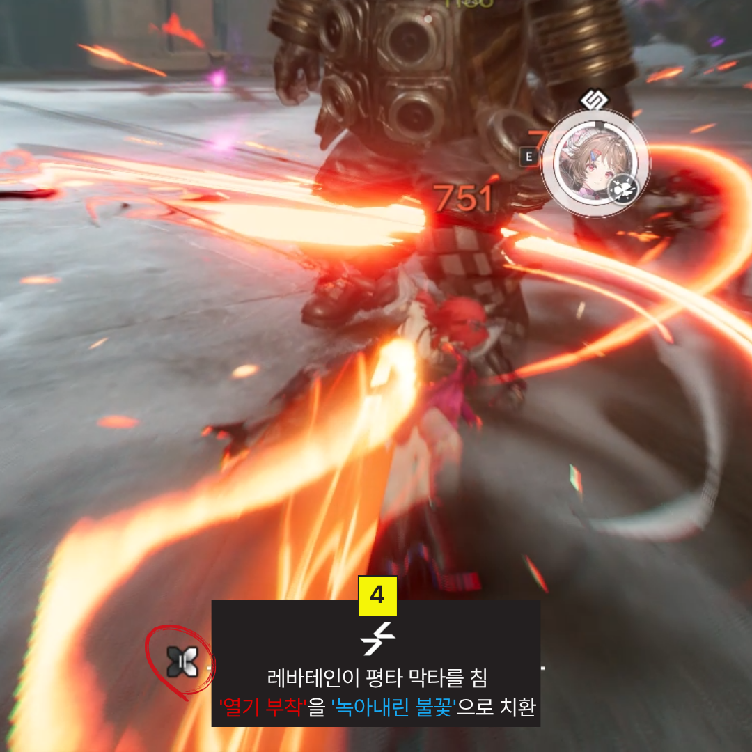 스킬 툴팁만 읽어보면 복잡해 보이지만 실은 아주 간단합니다. 열기 부착을 유발한 뒤 이를 강력한 일격 판정이 발생하는 평타 막타로 때려주거나, 적을 연소 또는 부식 상태로 만들어 레바테인이 연계 스킬을 사용하면 녹아내린 불꽃이 1회 쌓이고 이를 4회 쌓으면 불꽃의 심장이 켜지는 방식입니다.
