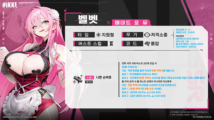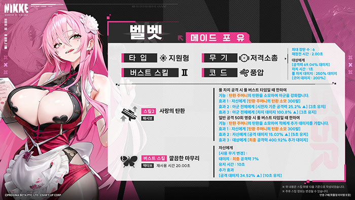 레벨인피니트가 서비스하고, 시프트업이 개발한 미소녀 건슈팅 액션 RPG '승리의 여신: 니케'가 1월 29일(목) 밸런타인 시즌으로 선보일 올해의 새로운 메이드 캐릭터이자 신규 SSR 니케 '벨벳'의 스킬 정보를 공개했습니다.