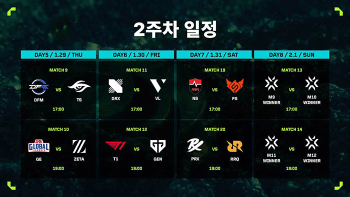 2주 차에 진행되는 중위조 경기 가운데 가장 눈길을 끄는 매치업은 젠지와 T1의 경기다. 두 팀은 지난 2025 VCT 퍼시픽 킥오프 결승 진출전에서 만나 T1이 접전 끝에 3대2로 승리를 거뒀다. 젠지를 따돌린 T1은 마스터스 방콕에 출전했고 우승까지 차지하면서 희비가 엇갈렸다. 지난 주 데토네이션 포커스미와 농심 레드포스에게 일격을 당한 상황까지 맞물리며, 두 팀 모두 분위기 반전이 절실해졌다. 젠지 특유의 탄탄한 운영 속에서 화력을 담당하는 ‘t3xture’ 김나라의 역할이 그 어느 때보다 중요하다. T1은 ‘stax’ 김구택의 노련한 오더를 바탕으로 젠지의 견고한 방패를 뚫어내야 승리할 수 있을 것으로 보인다.