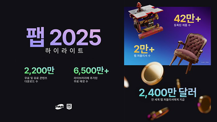 팹은 2025년 한 해 동안 빠른 성장세를 보였다. 팹에 등록된 에셋 수는 42만 개 이상으로 3배로 성장했으며 콘텐츠를 판매하는 퍼블리셔 수는 2만 명 이상으로 2배 증가했다. 같은 기간 크리에이터들은 2,400만 달러 이상의 수익을 창출했으며, 팹 프라이데이, 봄 세일, 여름 세일 등 주요 이벤트 세일은 월 매출의 최대 50%를 차지했다. 또한, 플래시 세일은 월 평균 매출의 약 25%에 기여했다.