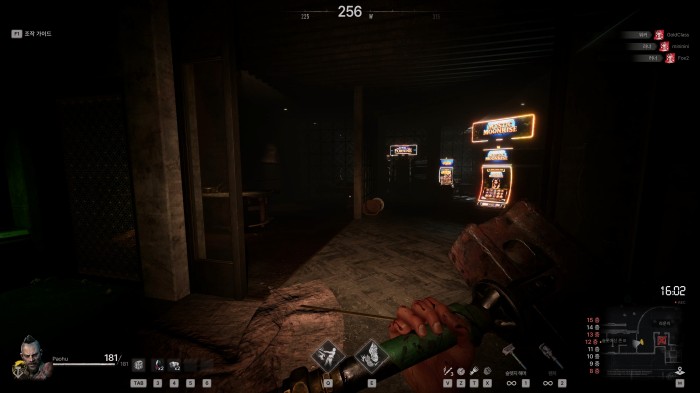 부분적으로 조명이 존재하는 곳도 있으나, 전체적으로는 매우 어두운 편이므로 플래시 라이트를 켜고 다녀야 하죠. 다만 어두운 곳에선 멀리서도 불빛을 확인할 수 있는 법. 상시 플래시 라이트를 켜고 다닐 경우, 경쟁 플레이어를 처치해 파밍을 시도하는 인간 사냥꾼들의 좋은 먹잇감이 됩니다.