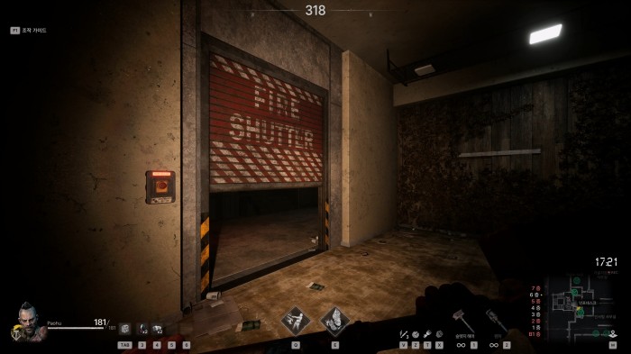개발자 노트를 통해 언급한 바 있는 'POI (Point of Interest, 관심지점)' 설계도 얼리액세스 버전에서 만나볼 수 있었습니다. 층을 이동할 수 있는 계단 입구에는 셔터가 설치되었는데, 버튼을 누를 경우에 육중한 철문이 개방되고 일정 시간 후에 저절로 닫히는 모습입니다. 특히 셔터를 조작하거나 닫힐 때에는 육중한 무게를 대변하듯 굉음이 울려퍼졌기에 멀리서도 플레이어의 위치를 파악 가능했습니다.