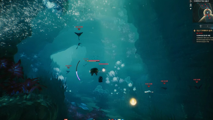 던전 공략을 시작하자마자, 절벽 아래 낙하해 물 속으로 진입해야 하며, 일정 구간을 잠영해서 이동하게 된다. 물 속에는 별다른 장애물이나 위협 요소가 없다. 또 잠영 중에는 흰색 구슬과 노란색 구슬을 획득할 수 있는데, 흰색 구슬을 입수하면 일정 시간 이동 속도 증가 효과를 얻게 된다. 다음으로 노란색 구슬을 획득하면 호흡 게이지를 회복할 수 있다.