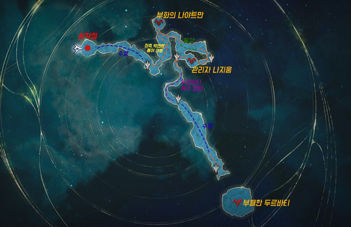 루트 이동 시에 가장 주의해야할 것은 바로 두르바티의 특수 패턴이다. 관리자 나지움을 처치한 후에 길을 막고 있는 '가시 덤불'을 제거하면, 공중에 두르바티가 등장하며 두르바티는 이동 길목에 독지대를 형성하는 브레스를 발사한다. 독지대는 지속 피해는 없으나 닿을 경우 매우 막대한 피해가 들어오므로 최대한 회피할 필요가 있다.