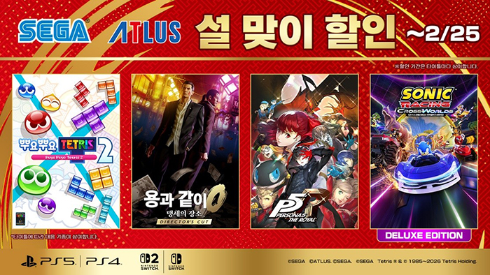 [자료제공 = 세가] 세가퍼블리싱코리아(대표 사이토 고)는 플레이스테이션 스토어 및 닌텐도 e숍에서 판매 중인 일부 타이틀을 기간 한정으로 특별 가격에 판매하는 '세가 설 맞이 할인'을 개최 중이다.