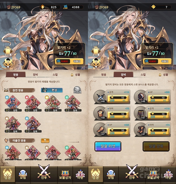 캐릭터 성장은 플레이어의 분신이라 할 수 있는 '발키리'의 성장으로 갈음되고, 수집의 대상인 영웅들은 '발키리'의 레벨을 계승합니다. 물론 장비 역시 마찬가지 시스템입니다. 영웅의 개별 성장은 중복 뽑기를 통한 티어 승급, 펫 장착 정도가 있습니다. 물론 계정 레벨이 성장함에 따라서 고유의 육성 콘텐츠가 하나씩 더 해금되긴 합니다만 이를 포함해도 지극히 신경써서 간소화했다는 점을 알 수 있습니다.