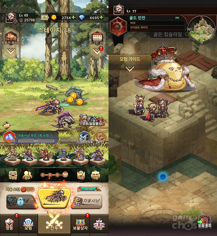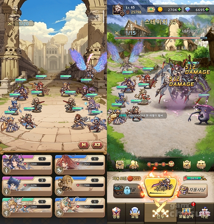 전투 자체는 자동으로 진행되어 관여할 부분이 없지만 전열과 후열, 속성 상성, 스킬 연계 등을 고려해 공략을 위한 진형을 구축하는 것이 중요하며 추후에는 성물이나 펫과의 조합으로 더 큰 시너지를 노릴 수 있습니다.