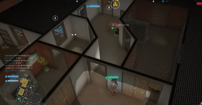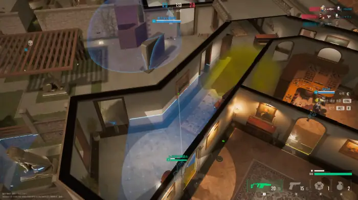 탑다운뷰를 채택한 만큼 플레이어는 자신의 캐릭터 뿐만 아니라 맵의 전체적인 구조를 쉽게 파악할 수 있으며, 팀원 캐릭터의 위치와 움직임, 그리고 교전 상황까지 실시간으로 확인 가능합니다.