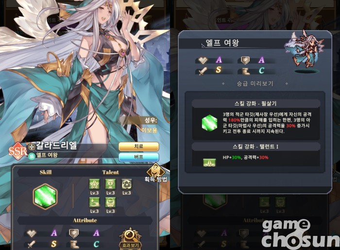 갈라드리엘은 아군 마법사의 공격력을 전투 종료까지 높여주는 버퍼다. 앞서 살펴본 소피아와 이블린, 이셋 모두 마법사라 갈라드리엘의 버프를 온전히 받을 수 있다. 돌파 시 추가되는 아군 전체 회복 효과도 매력적.