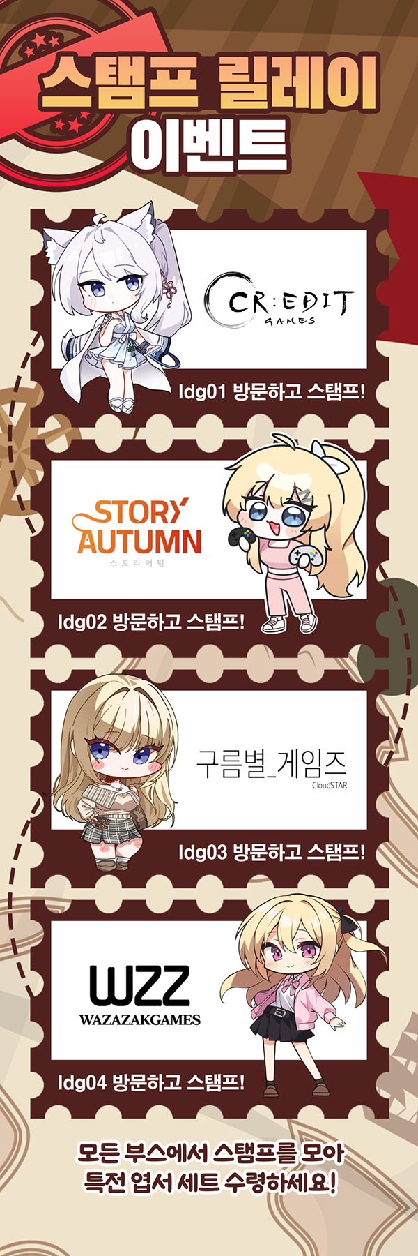 가장 눈길을 끄는 행사는 4개의 인디 개발사가 협력하여 진행하는 ‘비주얼 노벨 콜라보 스탬프랠리’다. 관람객은 비주얼노벨 연합 부스를 차례로 방문하여 각각 준비된 미션을 수행하게 된다.