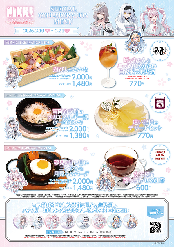 행사장 내 식당가와 비어홀에서는 니케 세계관을 따온 스페셜 콜라보레이션 메뉴를 선보인다. 대상 매장에서 2,000엔 이상을 구매한 이용자에게는 한정 스티커 1종을 랜덤 증정한다. 또, 행사 기간 중 지정된 시간에는 콜라보 이벤트 오리지널 의상의 '스노우 화이트', '홍련', '앨리스'로 분한 공식 코스프레 모델들의 특별한 이벤트가 있을 예정이다.