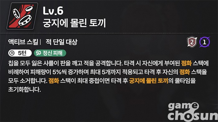 궁극기 궁지에 몰린 토끼는 1) 점화 스택 비례 피해 증가 후 점화 스택 삭제, 2) 점화 스택 5개일 때 타격 후 궁극기 쿨타임 초기화 효과를 가지고 있다. 특수기 스택 3개에 기본기 2회로 스택 2개가 쌓여 쿨타임 초기화 난이도가 매우 낮다.