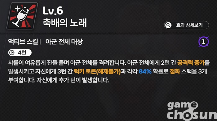 특수기 축배의 노래는 1) 아군 공격력 증가, 2) 자신에게 럭키 토큰, 3) 일정 확률 점화 스택 3개, 4) 추가 턴 효과를 가지고 있다. 공격력 증가와 추가 턴 만으로도 우수한 스킬인데 여기에 기본기 추가 버프와 점화 스택 3개를 얹어준다. 이 점화 스택 3개는 궁극기 회전의 핵심이 된다.