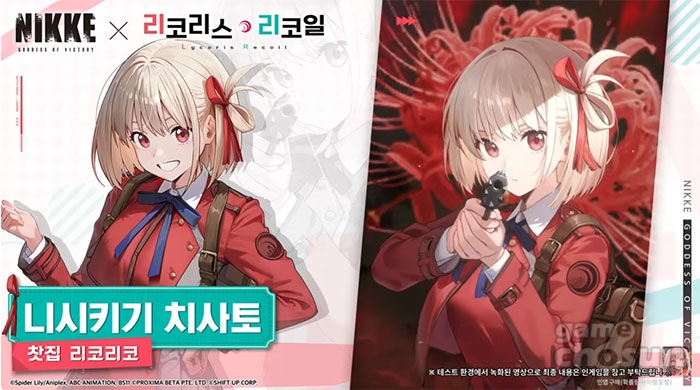 작중 절대 총알을 맞지 않는 수준의 반사 신경과 운동 신경으로 초인적인 능력을 보여주는 역대 최강의 리코리스이자, 밝고 긍정적인 에너지를 뿜어내는 평화주의자 '니시키기 치사토'가 콜라보 첫 캐릭터로 낙점됐습니다. 사람을 죽이지 않는다는 신념을 갖고 비살상탄환을 사용하는 인물입니다. 작중 '재능'을 가진 인물이 아니면 그녀와 근접 전투 자체가 불가능할 정도로 그려지죠.