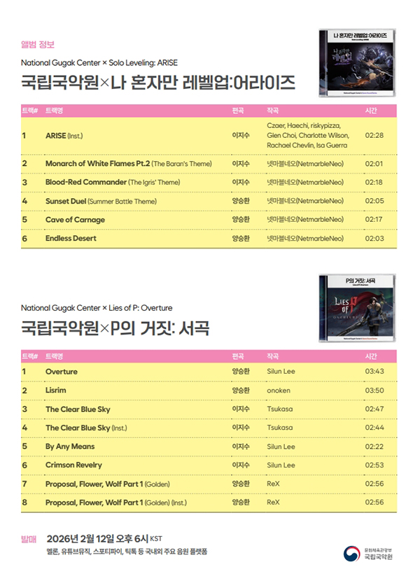 국립국악원 '게임 사운드 시리즈' 앨범 ‘국립국악원 × P의 거짓: 서곡’, ‘국립국악원 × 나 혼자만 레벨업:어라이즈’는 2월 12일(목) 오후 6시, 멜론·유튜브뮤직·스포티파이 등 국내외 주요 음원 플랫폼을 통해 공개된다.
