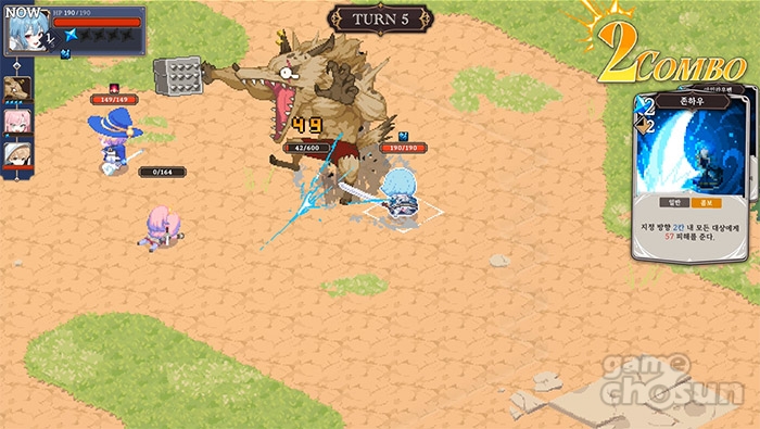정리하자면 첫 번째로 '마나'를 소모해서 '카드'를 선택해 스킬을 사용한다는 점인데, 여기에 일반적인 카드 게임에서의 체인 시스템처럼, 자신의 공격이 성공한다면, 자기가 원하는 모든 콤보를 계속 이어서 낼 수 있습니다. 그리고 콤보 발동 시에는 대상 역시 자신이 원하는 대로 선택할 수 있기 때문에, 하나의 행동에 여기저기 왔다갔다 하며 굉장히 스타일리시한 전투가 가능합니다.