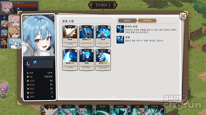 홍종현 대표. 지금 데모 버전에서는 '스타', '유우', '샬롯' 3종을 체험하실 수 있는데 이후 정식 출시 버전에서는 9종의 캐릭터를 준비 중입니다. 자신이 보유한 캐릭터 중 4명을 하나의 스테이지 전투에 참여시킬 수 있고, 전투 참여 시 턴 행동 순서도 결정할 수 있게 됩니다.
