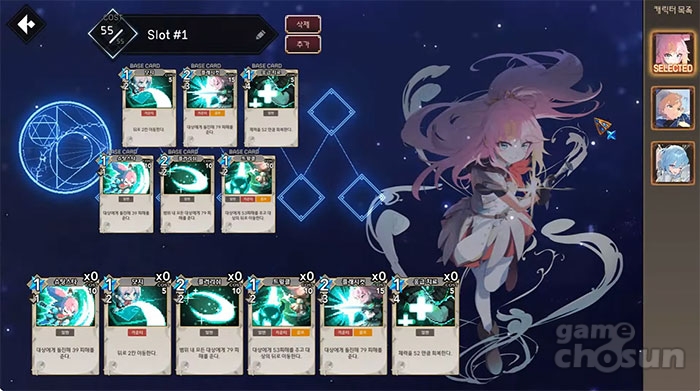 캐릭터당 15종류의 카드가 있고, 스테이지 진입 시 덱을 선별해서 입장할 수 있기 때문에 굉장히 다채로운 덱 세팅이 가능합니다. 예를 들면 콤보 위주의 덱을 짤 수도 있고, 카운터 위주의 덱을 짤 수도 있고, SRPG지만 매 스테이지마다 유저가 원하는 덱으로 원하는 플레이를 할 수 있다는 점이 가장 큰 장점입니다.