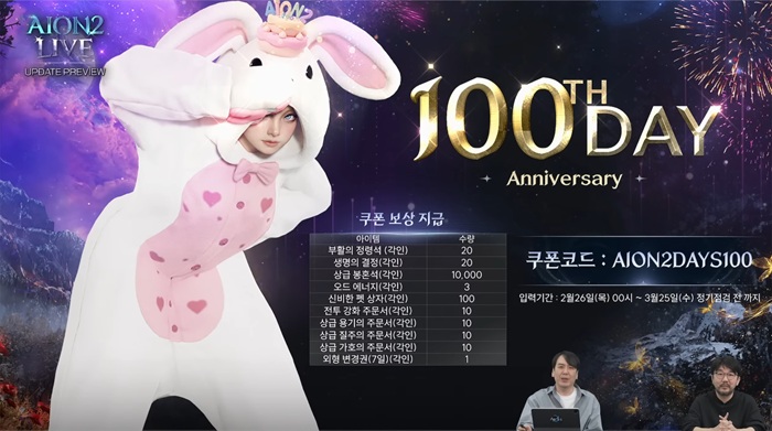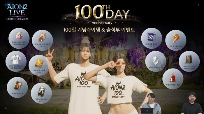 아이온2의 정식 서비스 100일을 기념한 다채로운 이벤트와 보상도 공개했다. 투구 및 흉갑 등의 외형과 함께 영혼의 서: 초기화, 외형 변경권, 영혼의 서, 원정/초월 도전권 선택 상자 등을 선물로 제공한다. 염색 비용 50% 할인 이벤트도 11일까지 진행할 예정이며 100일 기념 쿠폰 'AION2DAYS100'도 공개했다. 해당 쿠폰은 2월 26일부터 입력 가능하다.