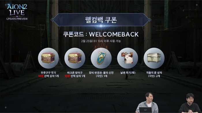 2월 25일 이후 입력할 수 있는 신규 쿠폰도 공개했다. 쿠폰 번호는 'WELCOMEBACK'으로, 우루구구 무기 10강 선택 상자 및 바크론 방어구 10강 선택 상자, 장비 변경권: 불의 신전 1개, 펫: 날쌘 루기, 그리고 격돌의 룬 상자 2개를 보상으로 제공한다.
