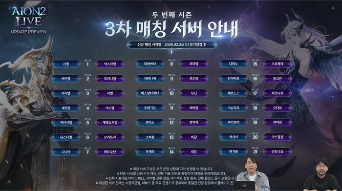 3차 서버 매칭이 25일 이뤄진다. 이번 서버 매칭은 기존과 동일한 서버도 존재하나, 전투 구도가 불균형인 서버의 경우 매칭이 바뀌게 된다. 또 상대적으로 인구가 적은 천족을 기준으로 아티팩트 점령전 시 입장 가능 인원을 임시로 조정한다.