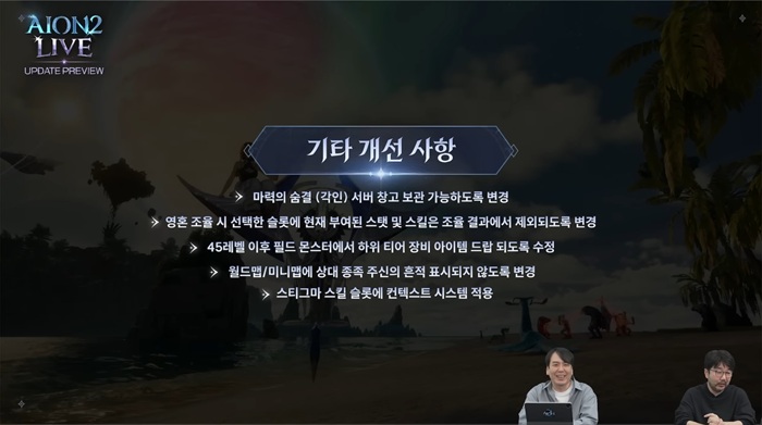 이외에도 악몽 콘텐츠의 '카이시넬' 난이도 하향이 이뤄질 것이라고 언급했으며, 날개 프리셋 기능을 현재 개발 중이라고 전했다. 또 명암 밝기 모드와 색약 모드 등도 개발하고 있으며 빠른 시일 내에 적용 예정이다.