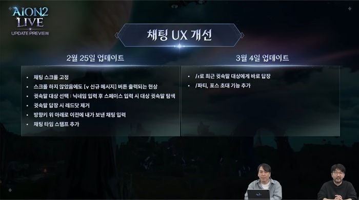 채팅 UX 개선 사항은 2월 25일과 3월 4일, 두 차례에 걸쳐 적용된다. 주요 개선 내용으로는 채팅 스크롤 고정 기능 추가와 스크롤하지 않은 상태에서 [v 신규 메시지] 버튼이 출력되는 현상 개선, 귓속말 대상 선택에서 닉네임 입력 후 스페이스 바 입력 시 대상 귓속말 탐색 기능 추가, 귓속말 답장 시 레드닷 제거, 방향키로 이전 채팅 내용 입력 기능 추가, 채팅 타임 스탬프 추가 등이 있다.
