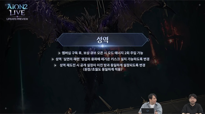 성역의 경우 맴버십 구독 시, 보상 큐브를 2회 개봉할 수 있도록 하며, 성역 '심연의 재련' 영겁의 용좌에 레기온 키스크를 설치 가능하도록 한다. 또 성역 재도전 시 공개 설정이 이전 방과 동일하게 설정되도록 변경한다.