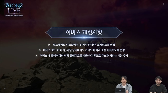 아울러 필드 네임드 몬스터 '감시자 카이라'가 월드맵 목록에 표시되도록 변경하고 어비스 보스 처치 시 사망 상태에서도 기여도에 따라 보상을 획득할 수 있도록 한다.