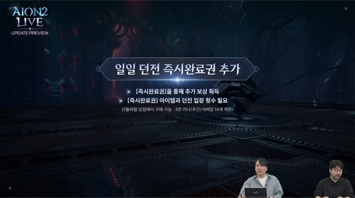 일일 던전에는 즉시 완료권이 추가된다. 이를 통해 추가 보상을 획득하는 것이 가능해지는데, 즉시 완료권은 산들바람 상점에서 개당 3만 키나에 판매된다. 매주 서버 당 14개까지 구매 가능하다.