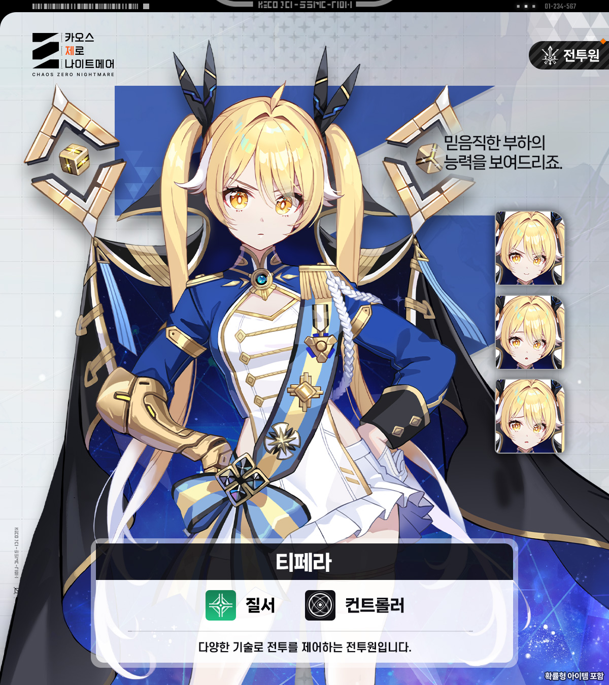 담당 전투원의 방어력 8~16% 증가. 소멸 카드 3장 생성 시 다음 사용하는 아군의 공격 카드 피해량 15~30% 증가 (최대 2중첩). 질서 카드로 실드/치유 모두 발동 시 1턴간 아군의 치명확률 +6~12% (최대 1중첩). |
