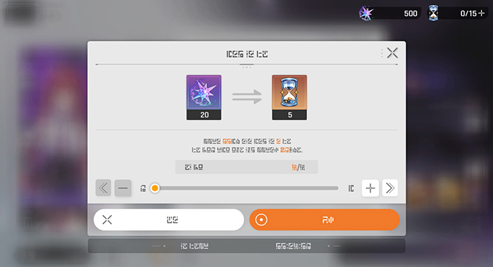 플레이 편의성을 위해 크리스탈을 소모하여 '시간의 모래'를 일일 최대 8회까지 충전할 수 있는 기능이 생겼다(단, 대균열에서는 충전 불가).