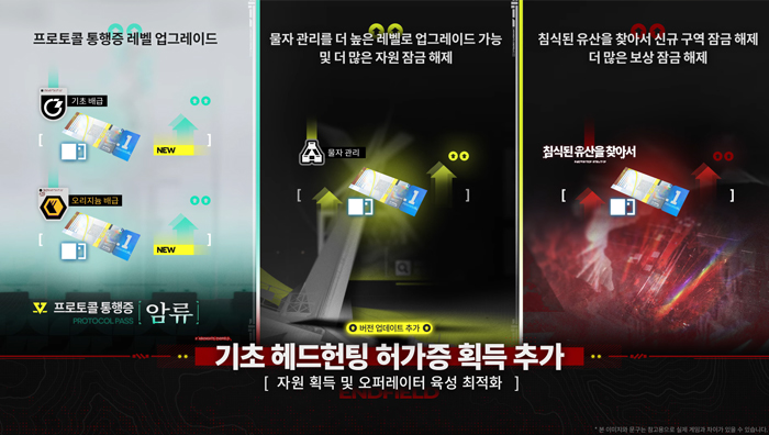 우선 관리자들이 새로운 오퍼레이터를 모집하는 부분에 있어 부담을 덜어낼 수 있도록 헤드헌팅과 관련된 신규 시스템이 도입된다. 신규 이용자들을 위한 프로모션인 '특별 허가 선물 이벤트'는 물론 상시 획득 가능한 기초 헤드헌팅 허가증의 획득 경로도 추가되고 모든 종류의 오퍼레이터가 중복 획득이 아닌 최초 획득에서도 통합 징표를 추가 획득할 수 있게 된다.