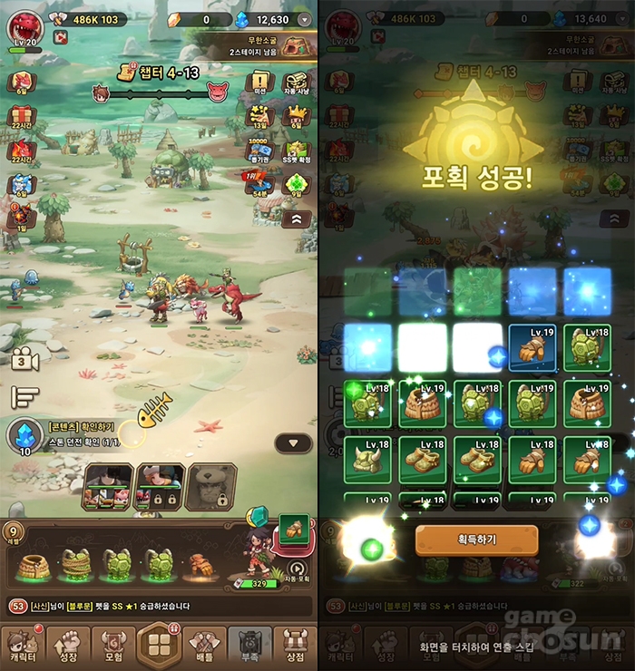 특히, 이미 다양한 IP로 여러 키우기류, 여러 방치형 RPG를 제작해, 장기간 운영했던 경험이 있는 '넷마블'답게 UI/UX의 직관적인 편리함과 촘촘하게 짜여진 보상 체계, 물흐르듯 연결되는 레벨 디자인 구조는 장르에 대한 높은 이해도에서 오는 기획의 노련함을 보여줍니다. 이러한 부분은 특히, '포획물'을 일거에 획득하고, 터치 한 번에 장비를 착착 교체할 때 빛이 나죠.