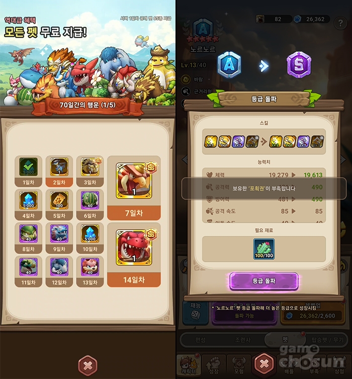 태생 등급에 상관없이 애정하는 펫이라면 누구나 최상위 등급까지 육성할 수 있는 구조를 채택했죠. 펫과 교감하고, 육성한다는 느낌이 중요한 '스톤에이지'답게 유저가 진정으로 '나만의 펫'을 키우는 재미를 느끼게 해주는 요소입니다. 이 같은 시스템을 확실하게 알 수 있도록 게임 출시 기념으로 A등급 '노르노르'의 조각을 연거푸 지급해서 SS등급까지 육성해볼 수 있도록 준비해놨습니다. 애초에 출석체크 보상으로도 SS 등급 펫을 그냥 주기도 하고 말이죠.